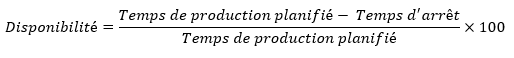 Exemple concret : Supposons qu'une machine est prévue pour fonctionner 12 heures par jour, de 7 h à 19 h. Si, un jour donné, elle subit une panne entre 10 h et 13 h, soit 3 heures d'arrêt, le temps de fonctionnement réel sera de 9 heures. La disponibilité pour cette journée se calcule donc comme suit :