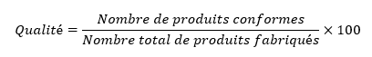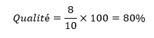 Exemple concret : Si sur 10 pièces produites, 2 sont défectueuses, il reste 8 pièces conformes. Le taux de qualité est donc :