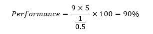 Exemple concret : Si un opérateur travaille pendant 5 heures sur une machine dont le temps de cycle théorique est de 30 minutes par pièce, l'objectif est de produire 10 pièces (5 heures ÷ 0,5 heure par pièce). Si seulement 9 pièces sont produites, la performance est calculée comme suit :